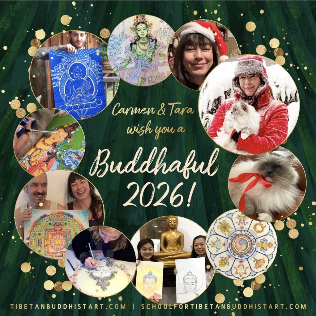 Read more Experiences by Students and See their Artworks LATEST NEWS: Dutch TV program ‘Zin in Morgen’ has been filming a full day during my Thangka Summer Retreat in The Netherlands. In nov 2025 it was broadcasted, and now I can finally show it to you. It’s become a beautiful portrait that shows me teaching and interacting with my students, who also show their artworks and speak about their experience. In the accompanying interview I speak about how I got in touch with Tibetan Buddhism, the importance it has in my life, my twelve years thangka painting study in an ancient lineage, how I created the Eight Auspicious Symbols for the Dalai Lama and how I met him personally. Watch the 8min video here: (links to my Youtube channel) ‘Zin in Morgen’ by KRO-NCRV is a heartwarming program with inspiring stories about finding meaning and ’small’ happiness. Lama Zopa Rinpoche’s wish makes for a special Thangka Course subject: The large Amoghapasha painting on the cliff above Lawudo, Nepal Lama Zopa Rinpoche in the Lawudo Cave Twenty-five years ago, Lama Zopa Rinpoche began expressing the wish that a large painting of the Buddha of Compassion be painted on a 30-meter high cliff in Nepal, above Lawudo (a special retreat place with which he has a deep connection), so that everyone in the neighborhood could see it. In recent years, Rinpoche specifically said it should be a painting of Amoghapasha. After Lama Zopa Rinpoche passed away in April 2023, people worked hard to fulfill this wish and in Nov. 2023 this special and large project (9.5 x 6.4 meters) was completed! Amoghapasha is painted directly on the rock face, overlooking the entire area, and from here spreads its blessings into the universe. Lama Zopa Rinpoche said: Rinpoche encouraged students to print and hang an image of Amoghapasha because of its many benefits. The past three times that His Holiness the Dalai Lama visited The Netherlands (2009, 2014 and 2018), Carmen Mensink is asked to welcome him in a special way by creating a large (9 meter / 30 feet long) special painting of the Eight Auspicious Symbols. Miroirs de l’âme Interview with Carmen Mensink in Dutch and the French edition of Happinez Magazine, Le Premier Mindstyle Magazine: “Pour les bouddhistes, une répresentation d’un bouddha n’est pas qu’une simple image, c’est une énergie vivante” Thangka Painting Retreats People from all over the world come together to enjoy the Tibetan Drawing & Painting Retreats that, with the meditation sessions and lectures on Buddhist art & symbolism are an in-depth experience. Lodging and all meals are included, as well as the beautiful surroundings, the wonderful food, and the new friendships that you will make! No drawing/painting experience needed. Check out the pictures! Pics Tibetan Art Retreat in ITALY 2023 Pics Tibetan Art Retreat in USA 2022 Pics Tibetan Art Retreat in the NETHERLANDS 2022 Pics Tibetan Art Retreat in ITALY 2022 Pics Tibetan Art Retreat in the NETHERLANDS 2021 Pics Buddhist Art Retreat & Sightseeing Tour in SRI LANKA in 2020 Tibetan Mandala created by over 100 visitors during Museum Night For the Museum Night Amsterdam, Carmen created a project where the visitors helped to paint a large (2x2m) Tibetan Mandala, the Mandala of the 5 Elements. She was asked for this by the Nieuwe Kerk (on Dam Square in Amsterdam) because of the special exhibition on the life of Buddha. Carmen can also be commissioned to paint a thangka of your choice, or to let her gild & paint your Buddha statues, according to the Tibetan Buddhist tradition. In the Thangka Shop you can find presents for yourself and others. In Tibet, the painting of thangkas was an important and highly developed means of expression through which the entire Buddhist philosophy could be explained. And it still has this function: thangkas are used in temples & monasteries and are hung above the altars to support the Buddhist meditation and practice. Carmen Mensink offers workshops in Tibetan Buddhist Art in Europe, United States and Asia. Most courses are for both beginners and advanced, and all courses come with a guided meditation, slide shows and talks on the symbolism of the subject (a Tibetan Buddha, Mandala or Symbol), and a lot of individual guidance. Carmen offers day classes and weekend courses in Buddha drawing, as well as in-depth thangka painting retreats that last a week or longer. She also offers individual teachings on thangka drawing and painting, for those who rather work one on one with a teacher instead of being in a group. There’s a lot of guidance and a lot of time to answer your questions. Carmen passes on the Art of Tibetan Thangka to her students with a lot of joy and dedication. She inspires them to reach their full potential in art and at the same time inspires them to go inside, meditate and check their mind and work on its potential, according to the Buddhist philosophy – which is inseparable from Buddhist Art. It doesn’t matter if people have drawing and painting experience or not, most important is the joy they experience during the courses and what’s going on inside themselves – which undoubtedly will be expressed in their artwork. [su_shadow style=”horizontal” inline=”yes”] Welcome painting for the Dalai Lama’s visit to The Netherlands, in the shape of a lotus flower with 8 lotus petals with the 8 Auspicious Symbols: Check out the Thangka Art Blogs: Testimonials Online Courses at the School for Tibetan Buddhist Art: “I’m still carrying the good energy from the course. Thank you! Also still amazed at the steps that were layed out for me to receive that energy and be surrounded by all of you. I am truly blessed!” “Always enjoy my time with you when you are in NY!! I am going to replace my desk with a drafting table, so I can continue with my work. Thank you for the inspiration! I look forward to seeing you next year and each year after whether it’s in NY or another country.” “Always e