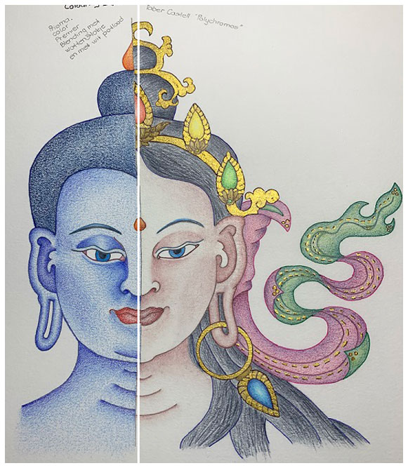 Ever wondered how such effects were created? Colour along with Carmen as she discloses all the techniques used to create the most stunning thangka drawings.