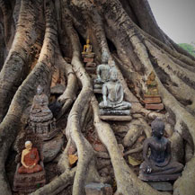 On the right a big banyan tree where buddha statues are placed in between his roots.